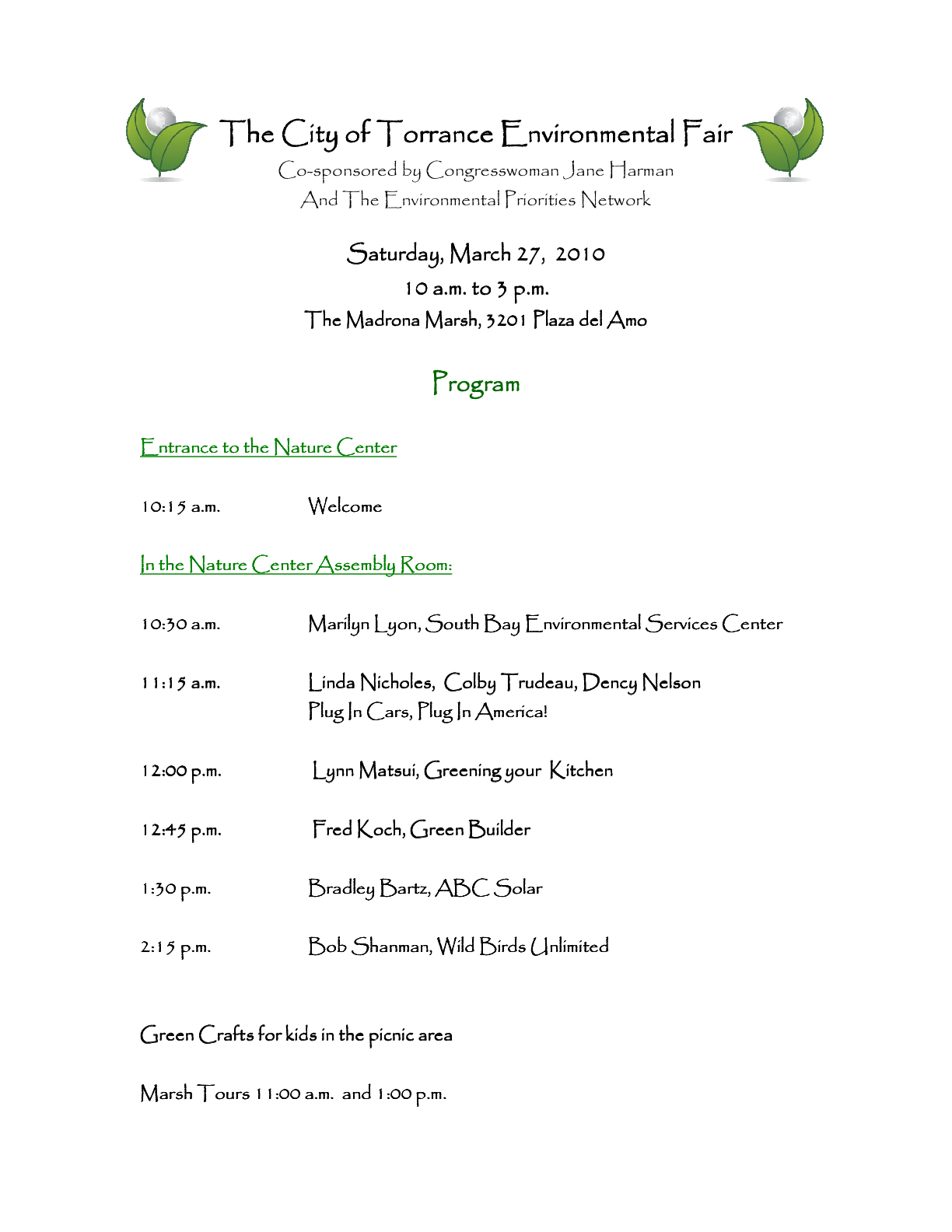 The fair is co-sponsored by Congresswoman Jane Harman’s office and my old pals at the Environmental Priorities Network. Plug-In America, the South Bay Environmental Services Center and solar powered renegade Brad Bartz of ABC Solar will all be there making presentations. Why not bicycle on over or drive your electric car? And don’t forget to tour the Marsh and learn about its history while you’re here.