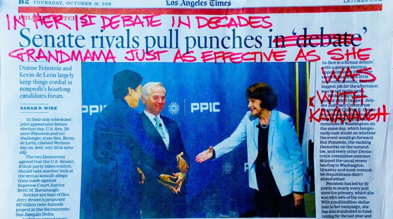 Octogenarian Senator DiFi Dodges & Hides As She Proves She Doesn’t Give A Shit About Californians #JoeTakesOnTheNews October 18, 2018Categories campaign, climate change, Community Activists, News, News Media, Truth & RealityDiane Feinstein, Kevin de LeonLeave a Comment on Octogenarian Senator DiFi Dodges & Hides As She Proves She Doesn’t Give A Shit About Californians #JoeTakesOnTheNews Share this: Click to share on X (Opens in new window) X Click to share on Facebook (Opens in new window) Facebook Click to email a link to a friend (Opens in new window) Email More Click to print (Opens in new window) Print Click to share on Reddit (Opens in new window) Reddit Like Loading... Related Published by creativegreenius View all posts by creativegreenius