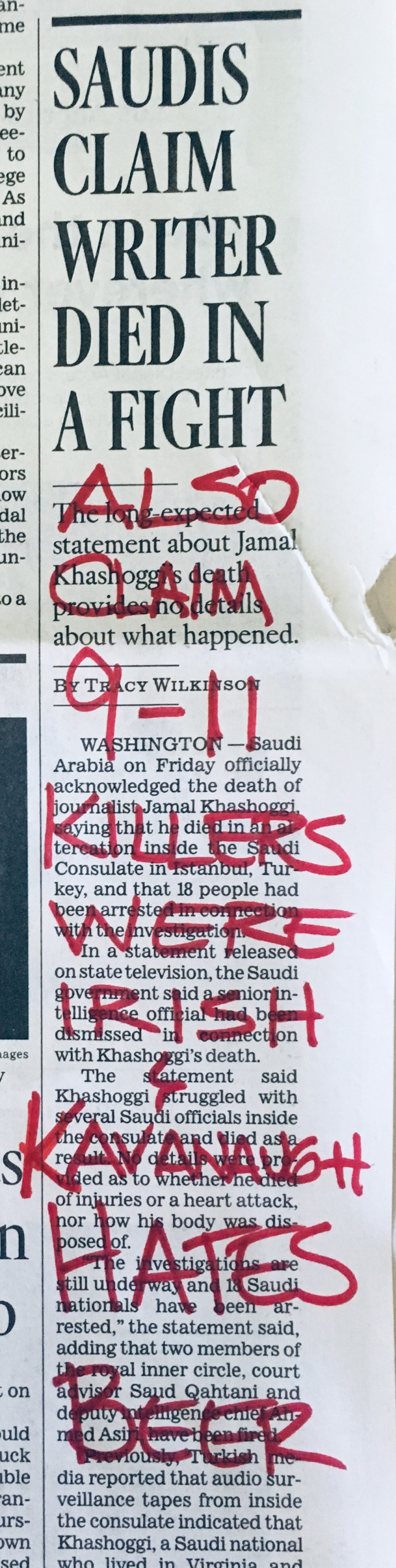 @LATimes – Isn’t Bonesawing The Body Of A Journalist Brutal Enough To Make The Headline? But Hey, Congrats On The New Food Writer #JoeTakesOnTheNews October 20, 2018Categories News, News Media, Truth & RealityLos Angeles Times, Saudi PrinceLeave a Comment on @LATimes – Isn’t Bonesawing The Body Of A Journalist Brutal Enough To Make The Headline? But Hey, Congrats On The New Food Writer #JoeTakesOnTheNews Share this: Click to share on X (Opens in new window) X Click to share on Facebook (Opens in new window) Facebook Click to email a link to a friend (Opens in new window) Email More Click to print (Opens in new window) Print Click to share on Reddit (Opens in new window) Reddit Like Loading... Related Published by creativegreenius View all posts by creativegreenius