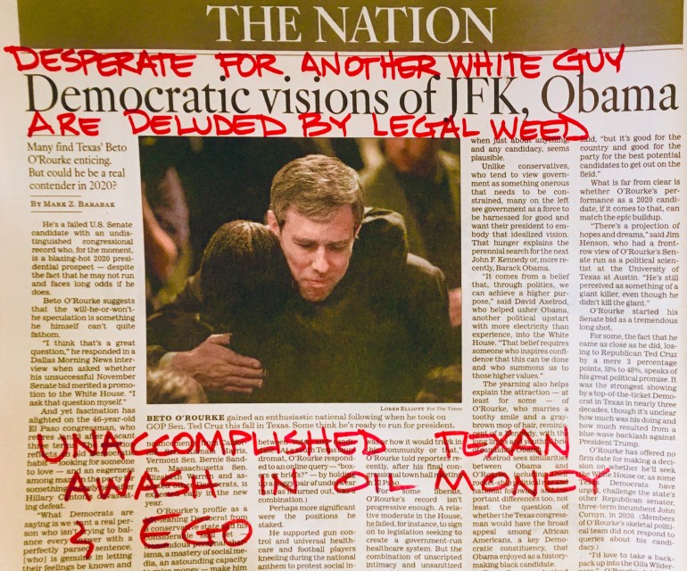 Democrats Reoccurring Dream Of Another Great White Hope Gives Mediocre Man Meteoric Media #JoeTakesOnTheNews December 26, 2018Categories election, Environmental Politics, greenwashing, News, News Media, politics, white privilegeBetoLeave a Comment on Democrats Reoccurring Dream Of Another Great White Hope Gives Mediocre Man Meteoric Media #JoeTakesOnTheNews Share this: Click to share on X (Opens in new window) X Click to share on Facebook (Opens in new window) Facebook Click to email a link to a friend (Opens in new window) Email More Click to print (Opens in new window) Print Click to share on Reddit (Opens in new window) Reddit Like Loading... Related Published by creativegreenius View all posts by creativegreenius