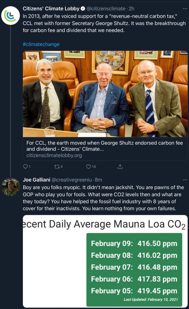 Front Group For Oil Company Representatives In Congress Celebrates All White Heritage; Called Out By Greenius, “CO2 Was At 395ppm When Shultz Endorsed Their Bullshit. It’s 416ppm today.” February 10, 2021Categories environmentLeave a Comment on Front Group For Oil Company Representatives In Congress Celebrates All White Heritage; Called Out By Greenius, “CO2 Was At 395ppm When Shultz Endorsed Their Bullshit. It’s 416ppm today.”