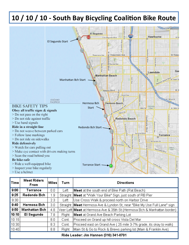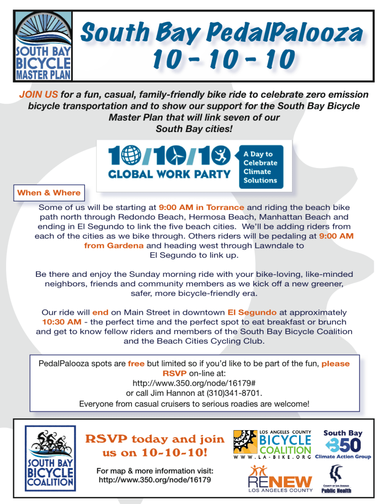 In fact back in 2010 that’s why the County of Los Angeles Health Department gave our South Bay Bicycle Coalition (SBBC) a $250,000 grant. We used that money to create and then help get passed the world famous Seven City South Bay Bicycle Master Plan. That’s the 20 year plan that lays out the blueprint for connecting bikeways in the cities of El Segundo, Manhattan Beach, Hermosa Beach, Redondo Beach, Torrance, Lawndale and Gardena. The plan that’s now being implemented bit by bit all over the place.